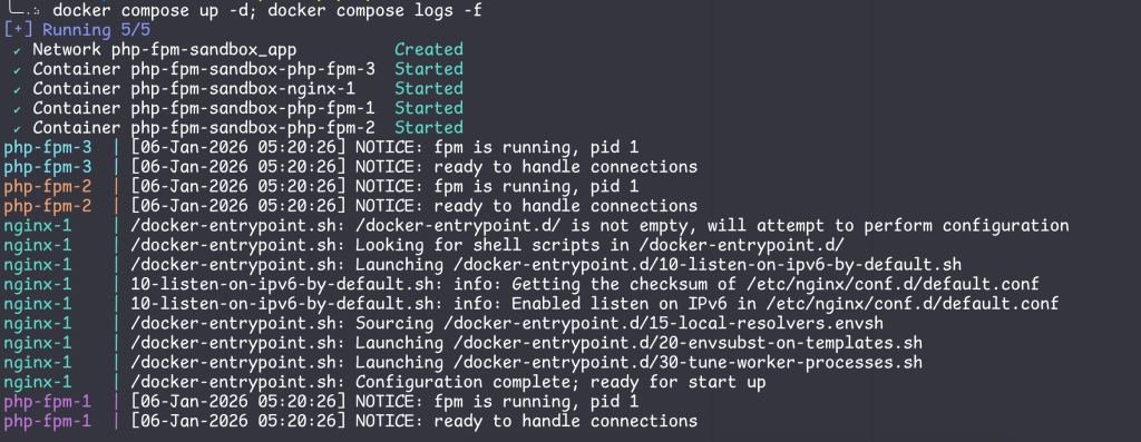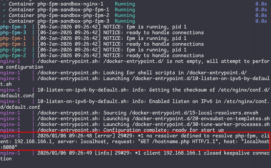 However, the requests still hit only one container. As it turns out, nginx performs the DNS resolution of the php-fpm hostname only ONE TIME. I have yet to find a source for this other than LLMs.